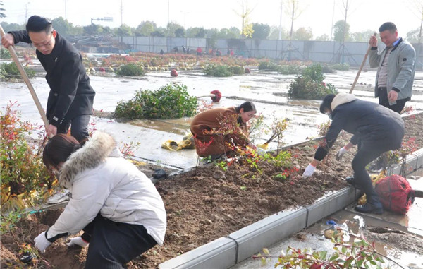 大家动作熟练、配合默契,顾不上汗水与泥泞,有的把泥挖松,有的把树苗扶正,每一道工序都做得一丝不苟。一番紧张的劳动后,一棵棵新栽的红叶石楠和一排排的南天竹错落有致、迎风挺立,为春天的奥特莱斯购物广场增添了更多绿意。