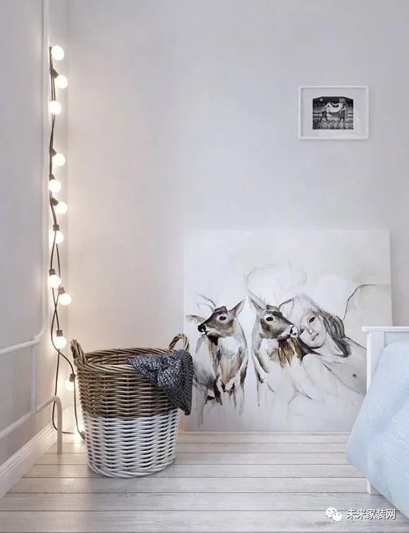 床尾墙面拐角处的灯带和收纳筐,随意的摆放方式显得更加自然,不必去刻意的追求设计效果,随意而为或许才是幸福的家居生活。