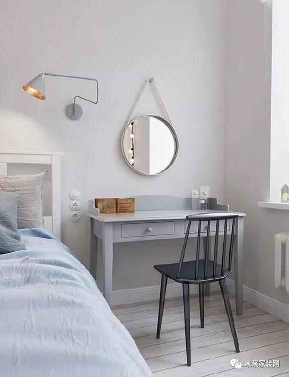 浅灰色的梳妆台,搭配漂亮的黑色椅子,墙面再挂上圆形的化妆镜,静谧的家居时光让人可以忘记所有的忧愁与烦恼。