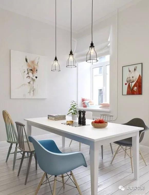 独立的餐厅空间,长方形的白色餐桌,配上几把造型、色彩不同的餐椅,有点复古的设计感让人感觉熟悉而亲切,越简单的装修反而更有品位。造型优雅的小吊灯,画面很个性的装饰画,恰到好处的软装搭配营造出温馨惬意的家居氛围。