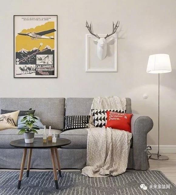 灰色的地毯,搭配灰色的布艺沙发,简洁而素雅的配色设计极具北欧风慵懒舒适的特点,再配上一张简易的圆形黑小茶几,惬意的家居生活让幸福感倍增。沙发的角落里配上一盏落地灯,后方的墙面利用装饰画和挂件来点缀,温馨舒适的家居生活来自于对每件软装饰品的精心挑选。