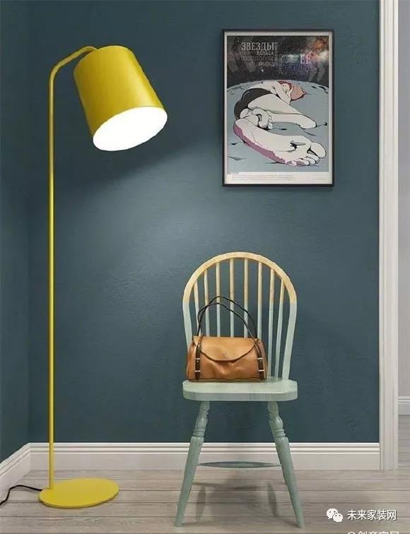 深海蓝的墙面,配上纯黄色的落地灯,强烈的对比色使用提升了空间的设计感。
